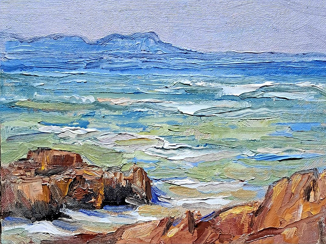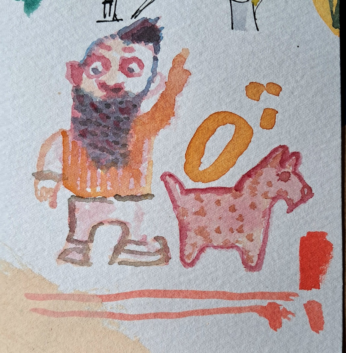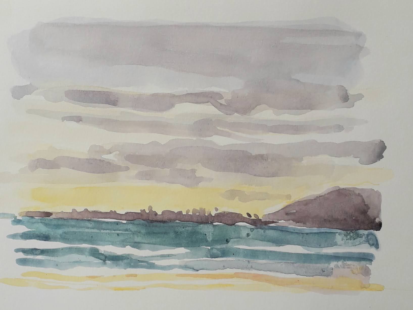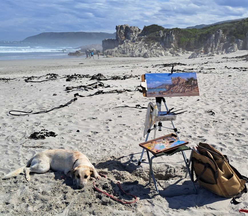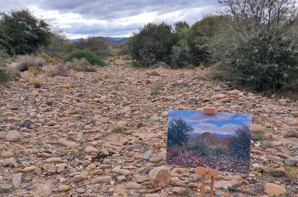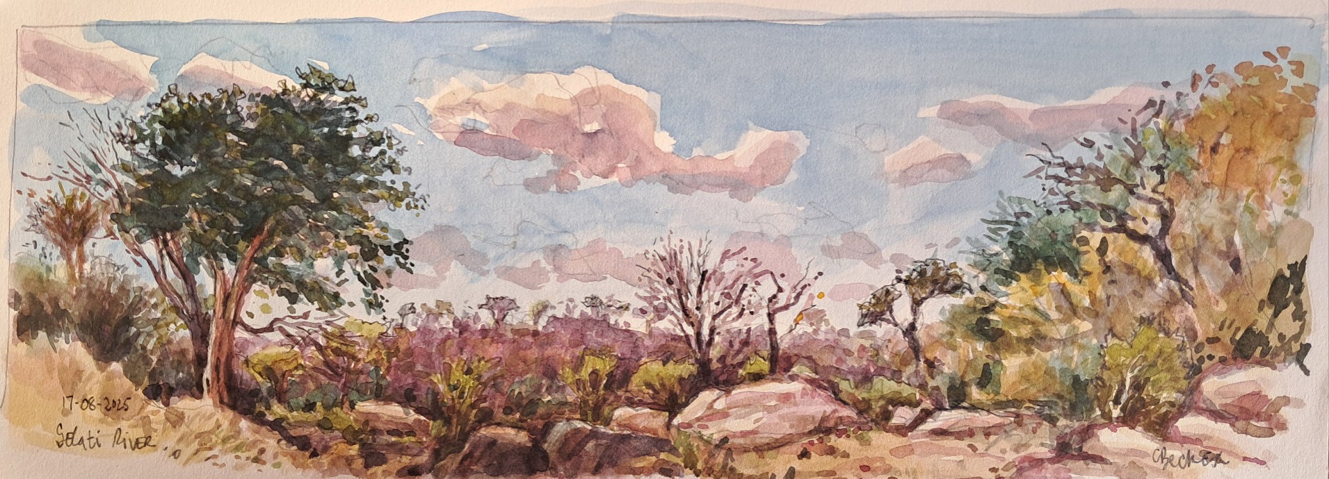 In the morning I wander down to the riverbed. The dryness of the earth is astounding, brittle grasses crunching underfoot. The colouration – mainly siennas and ochres – is right up my street. Fragrances of dung drift up from the warming earth. I’ve got watercolours and a small chair, and I set up on one of those huge granite boulders. There are intermittent shallow pools of water here and a kingfisher hovers and dives. Are there really fish in those pools? What is he catching? I know so little! Up river I see Impala and furtive Kudu flitting in and out of the shadows of the yellow Mopani trees. Could there be a better place than this? I paint because the slow, focussed, meditative act of painting is the best way I know to connect with this old world. But even in Arcadia things can go wrong, starting with dehydration and sunburn, and ending like this: