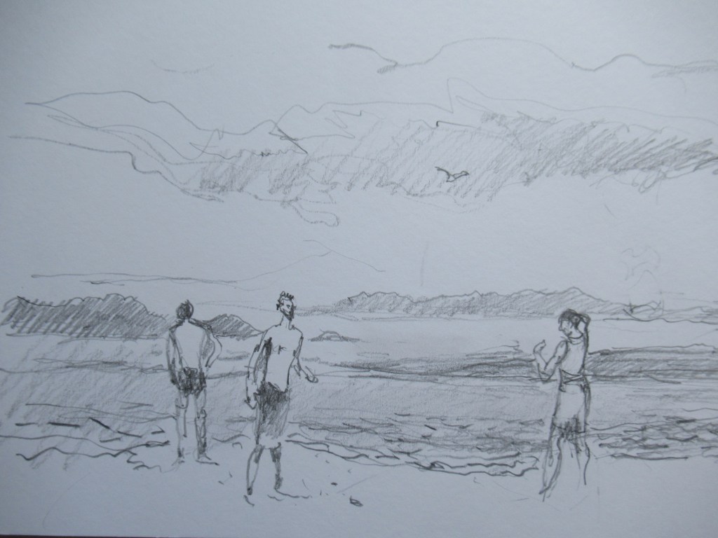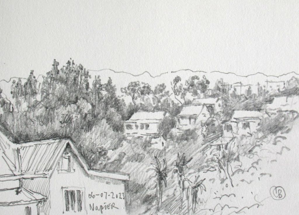 By a stroke of good fortune, I’ve again escaped the dank and stormy Western Cape. I’m in the Selati Nature Reserve, not that far from the Kruger Park. Right below our lodge runs the Selati River. OK, it’s not exactly running – but there are large pools of water just below the lodge, and these are often visited by Kudu, Impala, small antelope and many birds. The bushveld in winter is another story – perfectly warm windless days, followed by cool, crisp nights around the fire. The beautiful Nyala are almost tame and spend their days browsing around the lodge. They will obligingly linger long enough for a quick sketch.