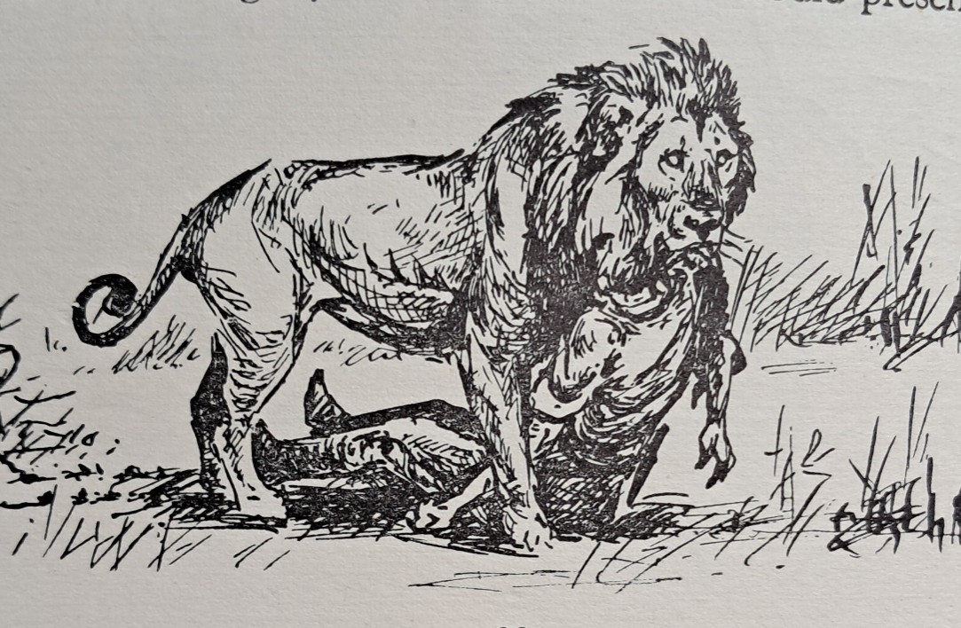 Lion attack illustration by the great CT Astley-Maberly. From Harry Wolhuter’s “Memories of a Game Ranger.”