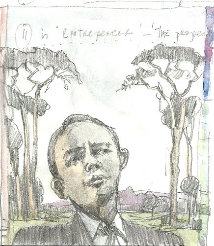 An autumn day in the Overberg. I’m off to Kleinmond and Betty’s Bay to draw, but, despite the sunlight, things are hazy and I decide instead to go inland. I take the road up the Hemel en Aarde Valley. We wind gently upwards past fabled wine estates. I have my sketching stuff with me, and of course the company of the intrepid Africanis, ears straight up, watching for baboons and guinea- fowl. At the top of the valley there’s a dirt road with a sign saying Karwyderskraal. I take a left there. I noodle on down the road, eating the dust of urgent Toyota bakkies. Where are they going in such a rush? They have business on those wine estates. Or maybe they’re Karwydering things. I take a right up a pine tree avenue, the De Bos dam down below. I’m seeing a lot of stuff, but its just not composing itself. Out of the car, there’s a chill wind, and I can’t get the car facing the right direction. I close the door on my thumb. I feel badly dressed, cranky, and out of sorts. I need new shoes. The clock is ticking.