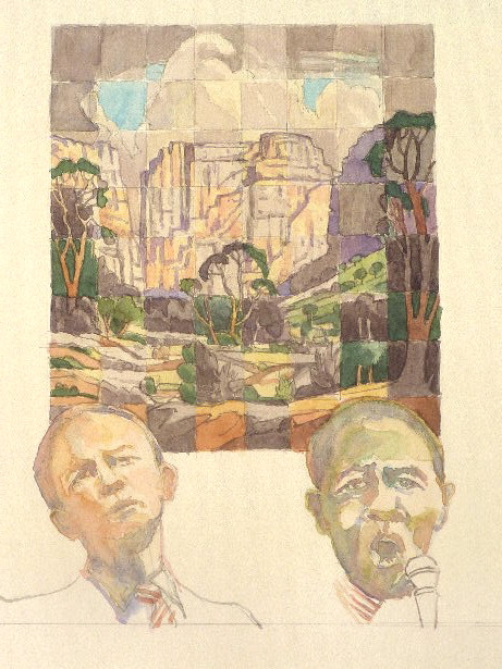 My little watercolour also picks up on that yellowish sky. Pierneef obviously had a lot of confidence in his working drawings as well as his colour notes. Again, they seem very accurate. And he’s made a very good job of imposing order on that chaotic jumble of rocks and vegetation at the bottom of the valley. As the shadows lengthen, I suddenly notice the expanse of space to my left. It’s vast, but stitching together a number of photographs, it’s paintable. That’s my version of the Valley of Desolation