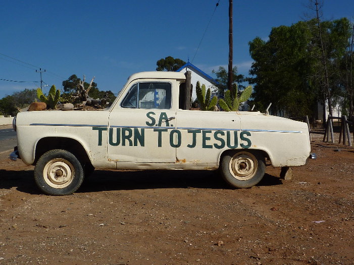 You go through the mountains at Buyspoort and you’re out of the Klein Karoo. As the landscape simplifies, the man-made mark on it seems more distinct. In Willowmore, a carefully put together but symbolically obscure piece: