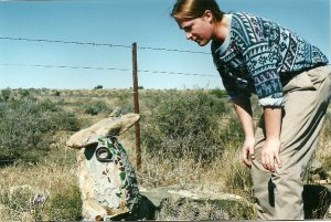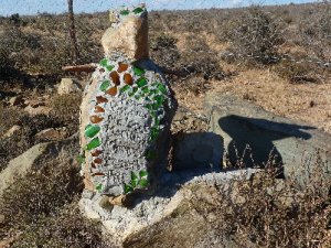Made out of stone, cement and broken glass, in the manner of Helen Martin of the Owl House, it has some names inscribed on its chest, and next to it the word “Tafirnaki’. (Actually Tabirnaki.) It is situated on a nondescript stretch of road about 45ks south of Aberdeen.