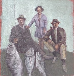 I set myself up and without too much scratching of the head, I get going. I have a piece of cardboard to paint on. That’s my way of overcoming the fear of the pristine canvas. Cardboard is actually a great surface to work on – ask Simon Stone. I meet a photographer called Leanne Stander and next thing she ‘s photographing the artist at work. Then a wandering Spanish bloke also has to take a pic. Why? Did he think he was seeing a great artist at work? Or did he perhaps think he had come across something rather quaint and antiquated, like a model T Ford ? Suddenly my quiet little Sunday afternoon oil-painting experiment is becoming a performance. Help! I’m under scrutiny!