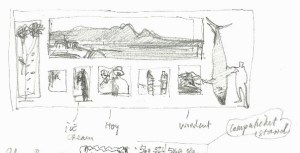 An autumn day in the Overberg. I’m off to Kleinmond and Betty’s Bay to draw, but, despite the sunlight, things are hazy and I decide instead to go inland. I take the road up the Hemel en Aarde Valley. We wind gently upwards past fabled wine estates. I have my sketching stuff with me, and of course the company of the intrepid Africanis, ears straight up, watching for baboons and guinea- fowl. At the top of the valley there’s a dirt road with a sign saying Karwyderskraal. I take a left there. I noodle on down the road, eating the dust of urgent Toyota bakkies. Where are they going in such a rush? They have business on those wine estates. Or maybe they’re Karwydering things. I take a right up a pine tree avenue, the De Bos dam down below. I’m seeing a lot of stuff, but its just not composing itself. Out of the car, there’s a chill wind, and I can’t get the car facing the right direction. I close the door on my thumb. I feel badly dressed, cranky, and out of sorts. I need new shoes. The clock is ticking.