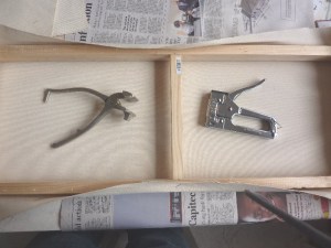 You need a stapler and, unless you have a particularly strong pair of thumbs, a purpose built canvas gripper. This is a good thing to do on a Saturday afternoon. I recommend the boeremusiek programme on RSG as audio accompaniment, but that is optional. The trick is to get it stretched tight, but not too tight. You should only take tea whilst doing this. Definitely no liquor. That will count against you when it comes to the folds on the corners.