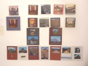 The square ones at the top are 20cmx20cm – part of a set of twenty. The bottom row of paintings are an old standard size: 9×12 inches. They’re done on Belgian linen, made up in Jo’burg about seven years ago. At last, the right moment and the courage to paint on them! Belgian linen is the holy grail of paint surfaces (particularly oil primed BL).